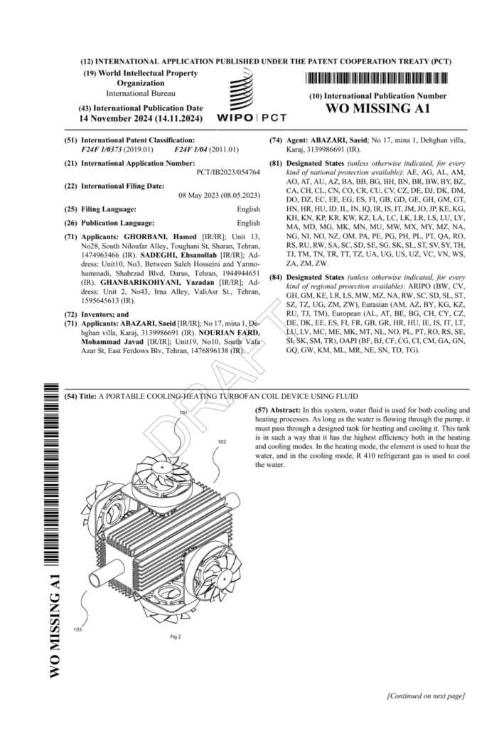 This page features an international patent application published by the World Intellectual Property Organization for an innovative portable heating and cooling system. The invention describes a multipurpose fluid-based device capable of both heating and cooling functions.