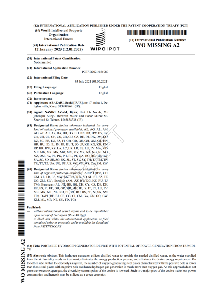 This page features an international patent application published by the World Intellectual Property Organisation for a portable hydrogen generator device with promising applications for small-scale power generation. The invention, filed by Iranian inventor Saeid Abazari, utilizes a novel electrolysis process to generate hydrogen gas from water with relatively low-energy input.
