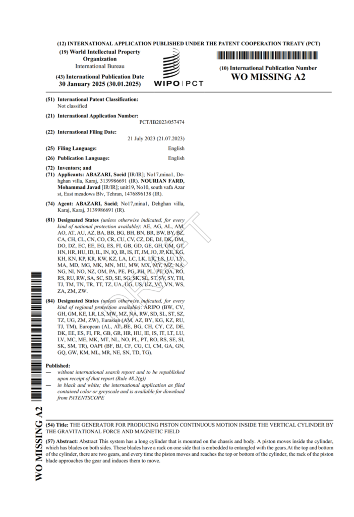 This page features an international patent application published by the World Intellectual Property Organization describing an innovative device for producing continuous piston motion inside a vertical cylinder. The invention, filed by Iranian inventor Saeid Abazari, utilises a simple yet ingenious design that leverages the natural forces of gravity and magnetism to generate a perpetual rotation effect.
